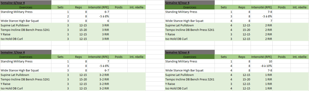 Cependant, je peux comprendre que pour de nombreuses personnes s’entraîner, soit un défouloir ou un moyen de se dépenser et c’est pour cette raison qu’elles souhaitent amener beaucoup d’intensité dans leur entraînement. Souvent, cette intensité sera mal distribuée en étant attribuée au travail principal avec des soulevés techniques et lourds. Pour toutes les raisons mentionnées plus tôt, je trouve que ce n’est pas un modus operandi idéal. Il est toutefois possible d’amener plus d’intensité dans son travail d’assistance. Le but de ce travail est de soit remédier à un point faible soit construire du muscle. Il est courant d’utiliser des exercices moins techniques, impliquants moins de muscles et par conséquent pouvant être moins chargés. La fatigue induite et les risques qui en découlent seront bien moindre. En pratique, une séance d’entraînement comprenant les lifts principaux et l’assistance pourrait s’organiser comme ceci et progresser de cette manière au fur et à mesures des semaines.